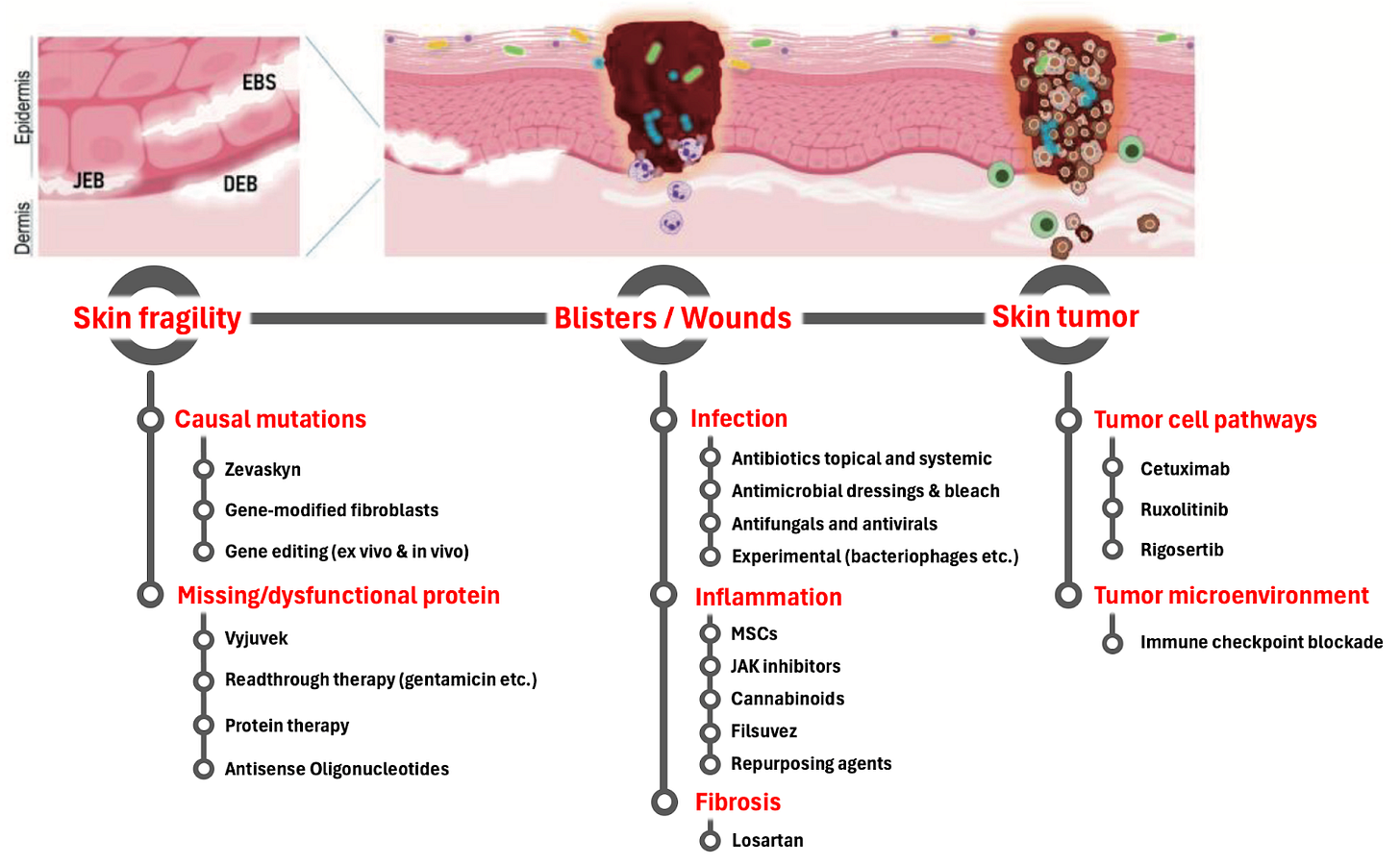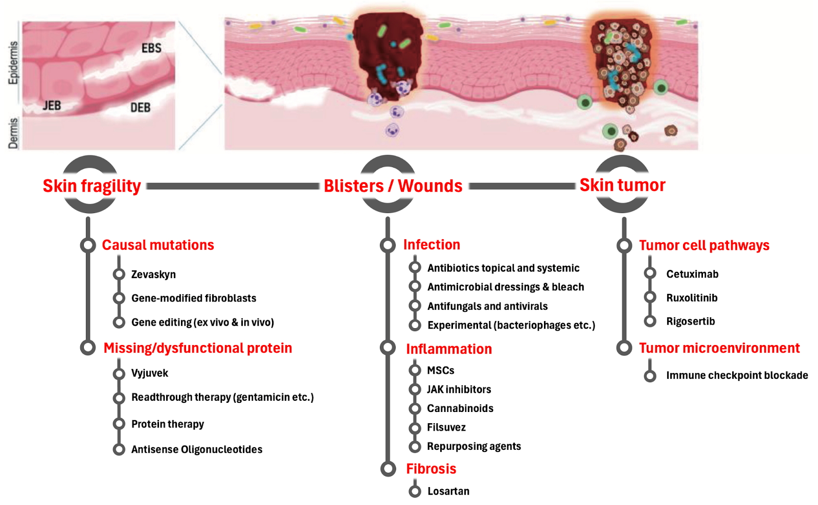 Taken together, these strategies represent a shift from purely supportive care toward mechanism-driven intervention — treating the underlying inflammatory and fibrotic biology of RDEB, not just its downstream complications. The challenge will be balancing efficacy with safety in fragile skin, and determining how best to combine anti-inflammatory and anti-fibrotic approaches for durable benefit.
