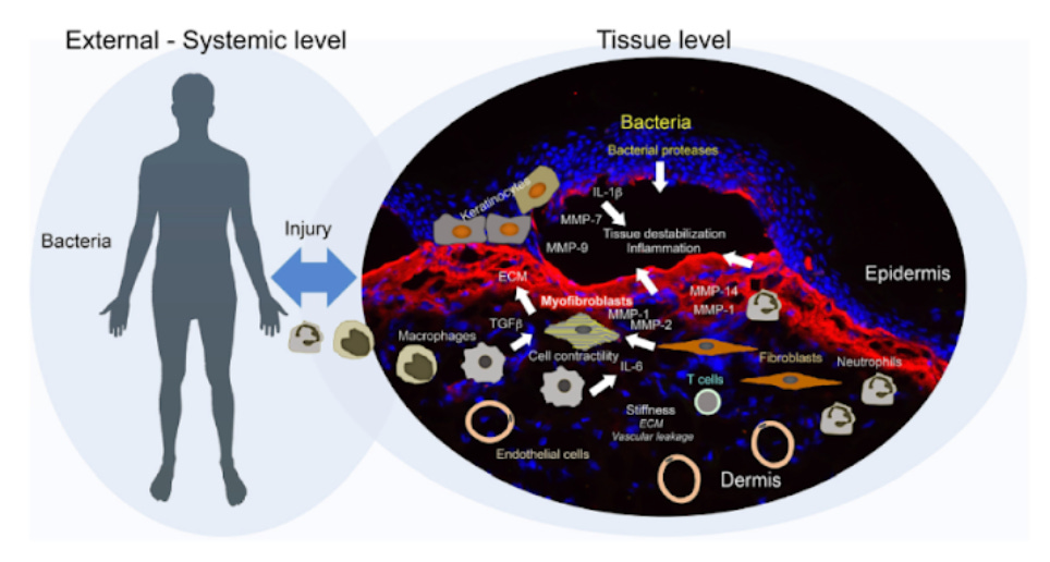 Keratinocytes and resident immune cells release pro-inflammatory cytokines, including IL-1⍺ and β (interleukin-1 alpha and beta), which trigger the recruitment and activation of additional immune cells through inflammatory signaling pathways. Moreover, C7 is more than a structural protein, its loss triggers dysregulation of pro-fibrotic and pro-inflammatory signals – of which heightened TGF-β (transforming growth factor beta ) activation in the dermal wound environment might be particularly important in the context of fibrosis. Studies show C7-deficient fibroblasts compared to normal fibroblast tend to display enhanced TGF-β activity including increased TGF-β cytokine expression, along with other altered cytokines, while addition of exogenous C7 can normalize their behavior (Nyström et al., 2013; Akasaka et al., 2021).