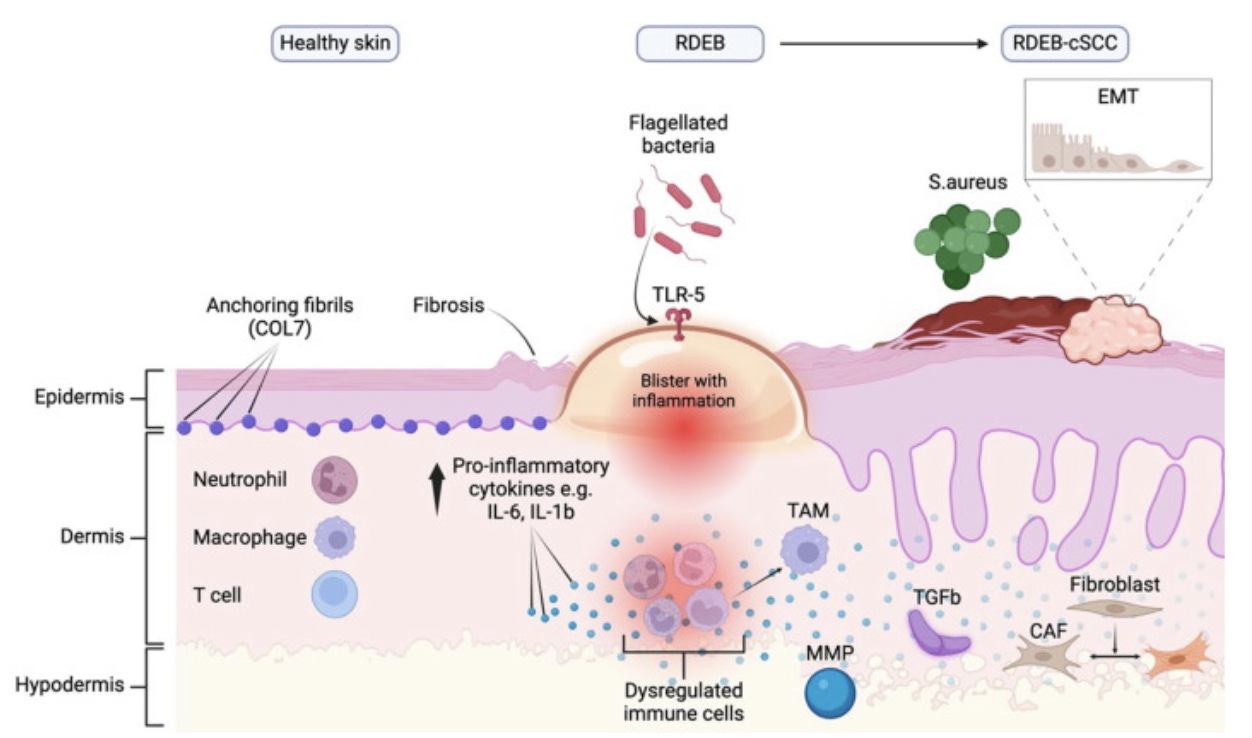 Recessive Dystrophic Epidermolysis Bullosa (RDEB) is often described as a skin-fragility disorder, but that misses the bigger picture. The constant blistering and open wounds in the absence of collagen 7 (C7) don’t just damage the skin — they set off a relentless inflammatory cascade that affects the whole body. Every blister is an acute injury.