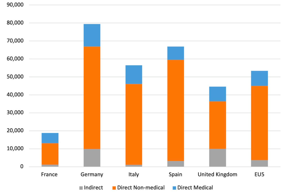 Fig. 4. Mean annual costs for all dystrophic epidermolysis bullosa patients across countries (2020, €). For severe patients the costs can be much higher. From Angelis et. al. Orphanet J Rare Dis, 2022, 17(1):346.
